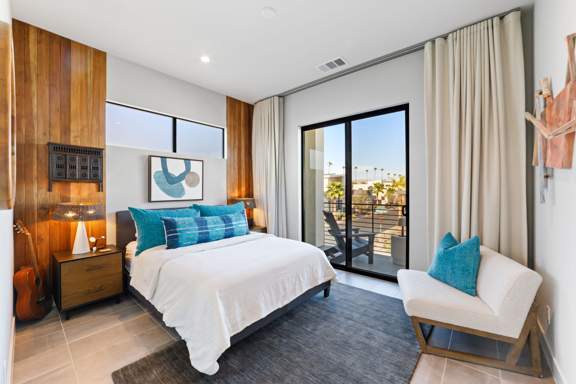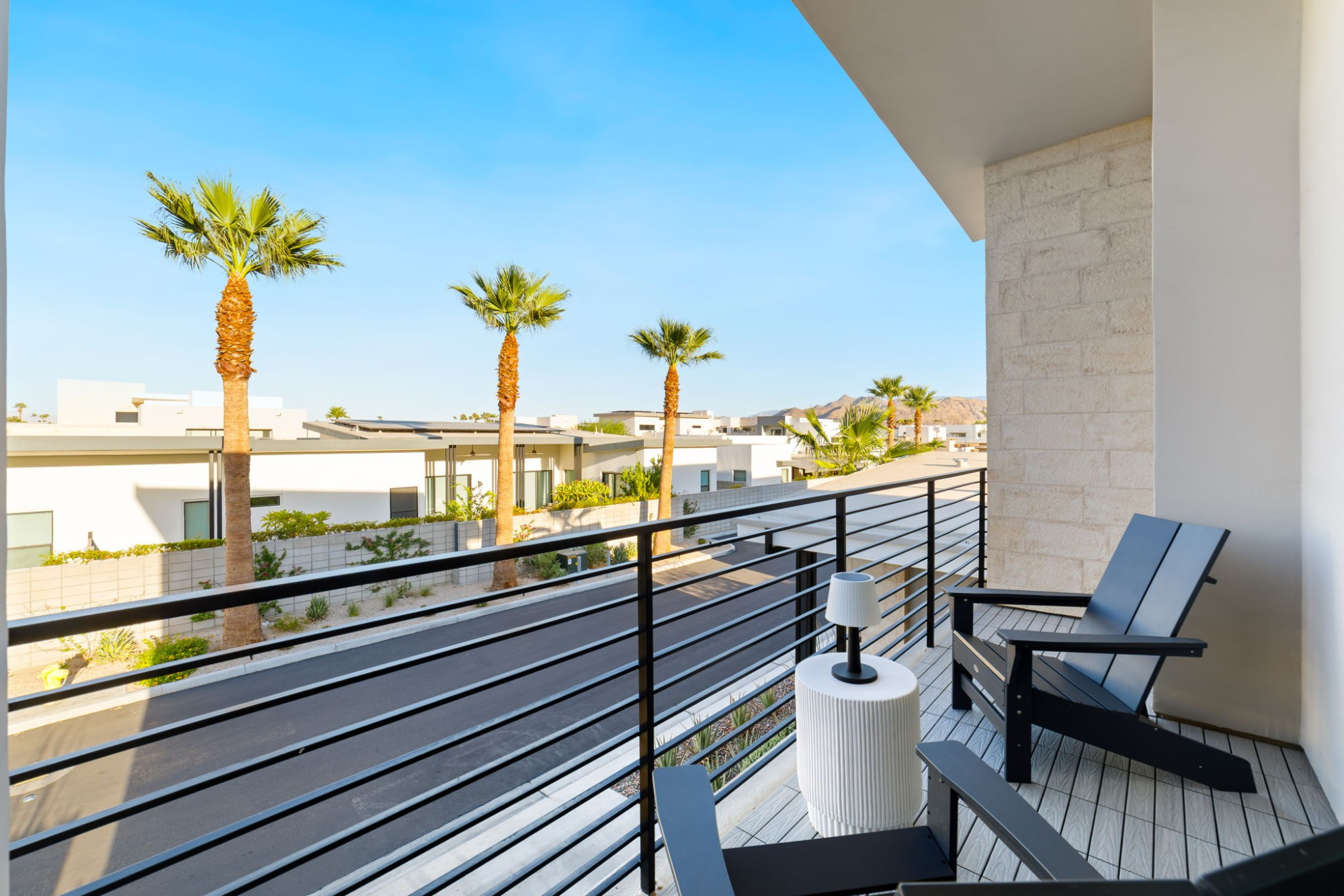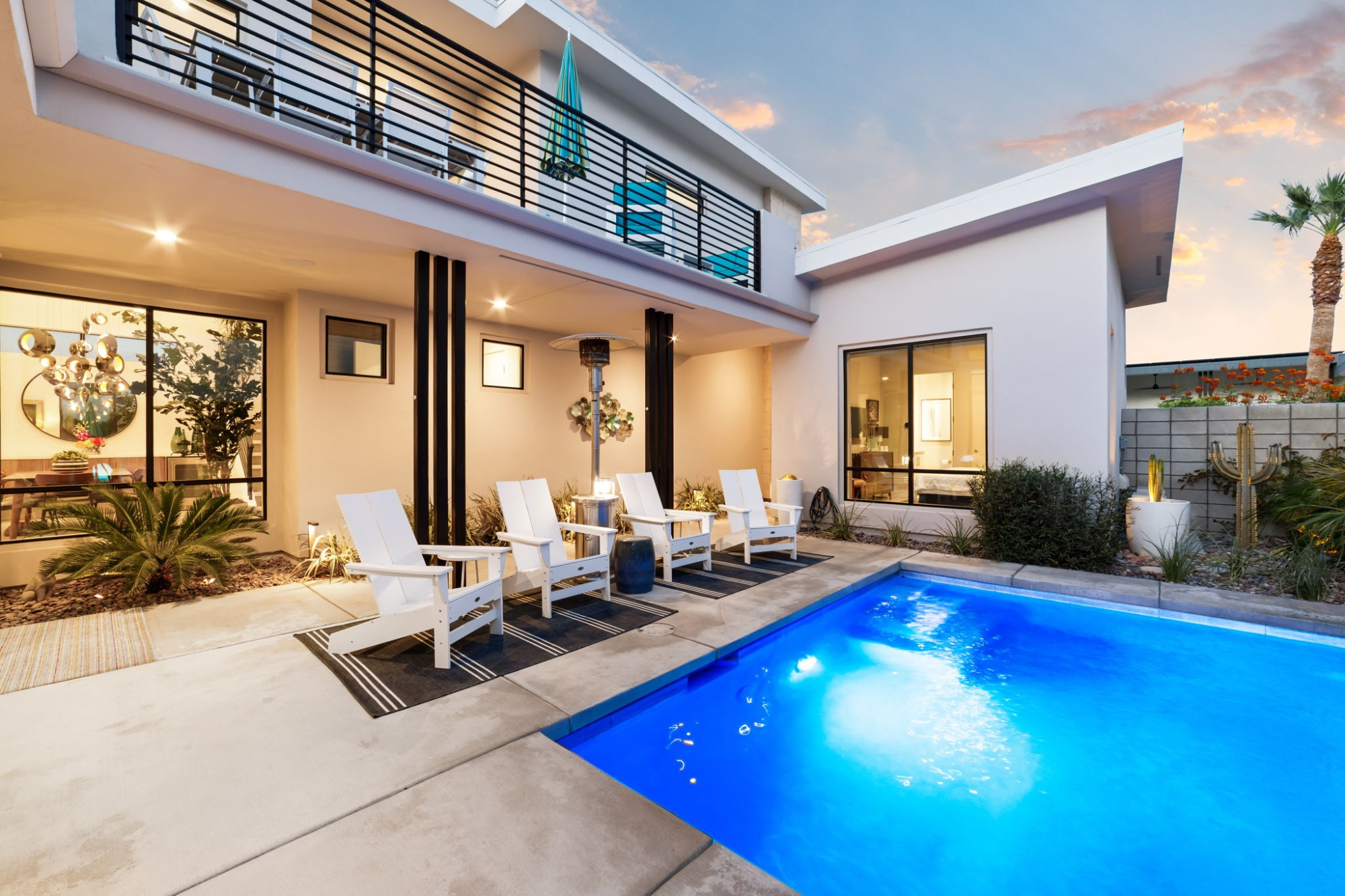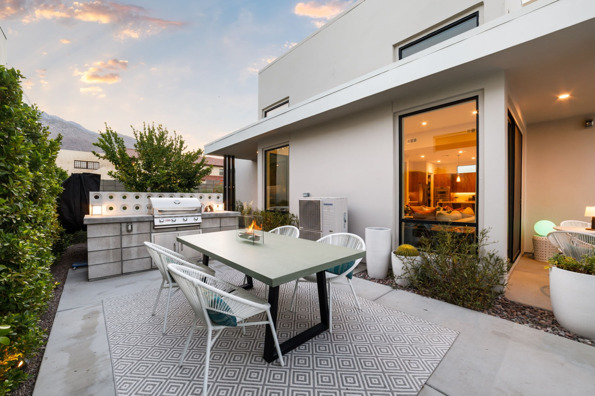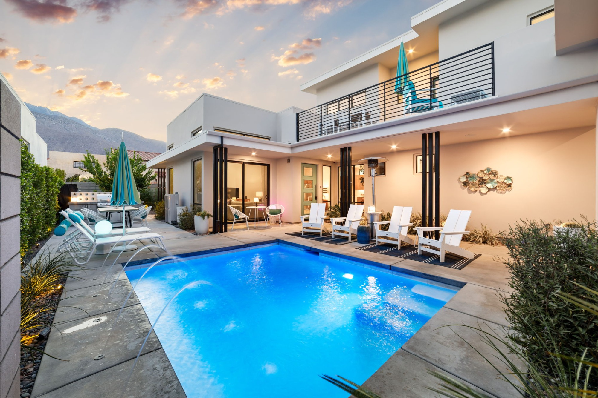 We are excited to introduce 111 Holliday Way, a stunning home in the recently completed Vue development in central Palm Springs. This former model home and end unit boasts one of the largest lot in the development and is ideally located within a pedestrian-friendly distance of downtown Palm Springs. This unique residence features three bedrooms, three and a half bathrooms, and a detached casita, perfect for guest privacy. It comes equipped with owned solar, a pool and spa, a built-in outdoor cooking area, and a two-car attached garage. Inside, you'll find numerous upgrades and thoughtful design elements. The dining area is highlighted by a modern chandelier and impressive 20-foot ceilings. The open-concept kitchen serves as a central gathering space, seamlessly connecting to the living area with a fireplace on one side and the dining area, which leads to an upstairs Library Loft, Private Bedroom and expansive Deck. All bedrooms are en-suite, providing comfort and convenience. The home includes multiple outdoor seating areas offering views both east and west from multiple levels and truly special views of Mt. San Jacinto. The home is located within a gated community and offers the new owner an abundance of privacy. Some furnishings are available outside of escrow, and a detailed list of upgrades is attached to the listing.