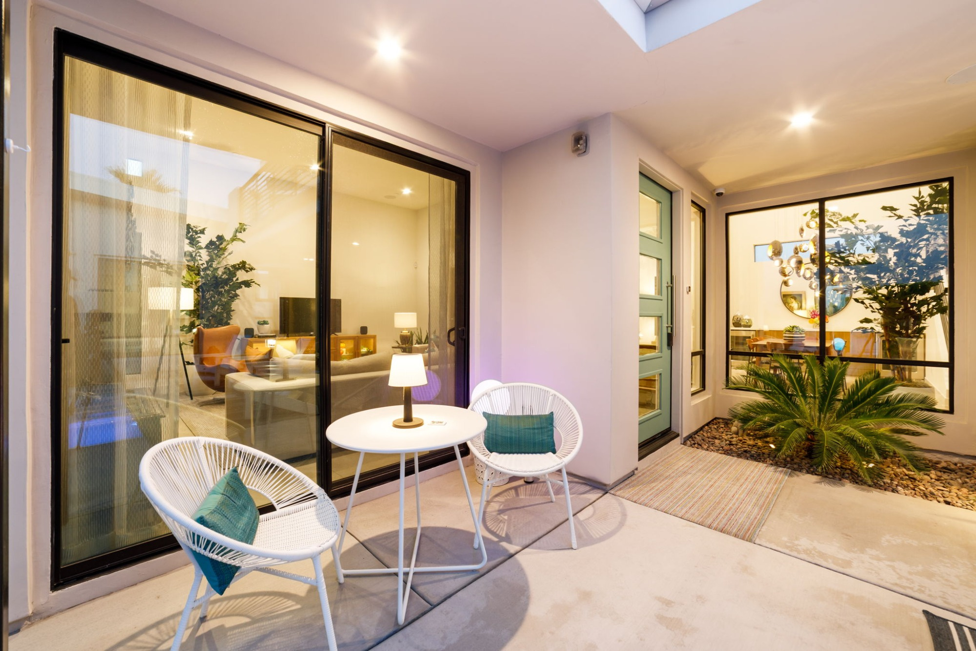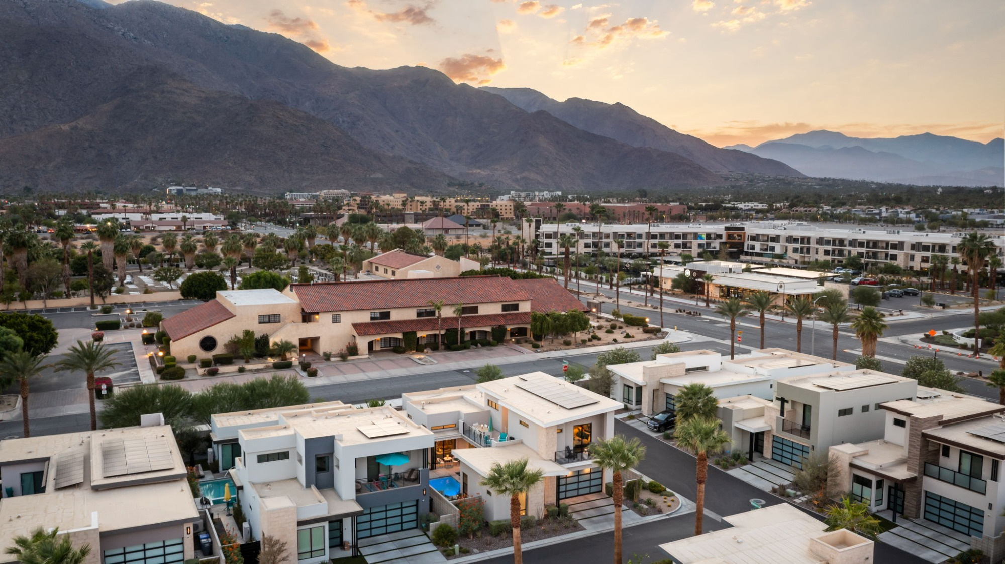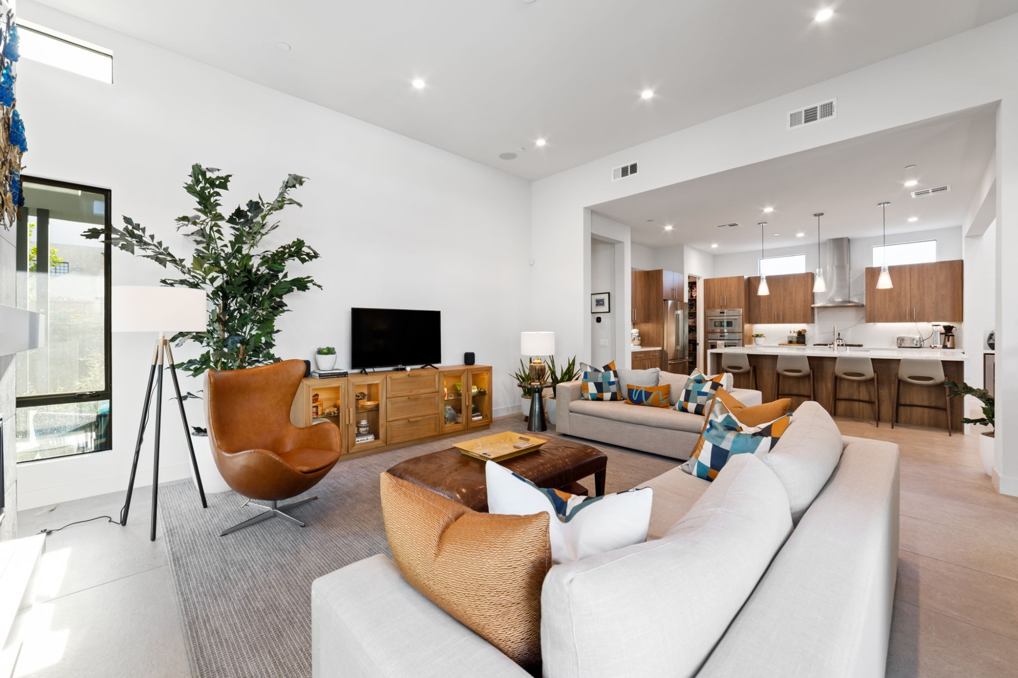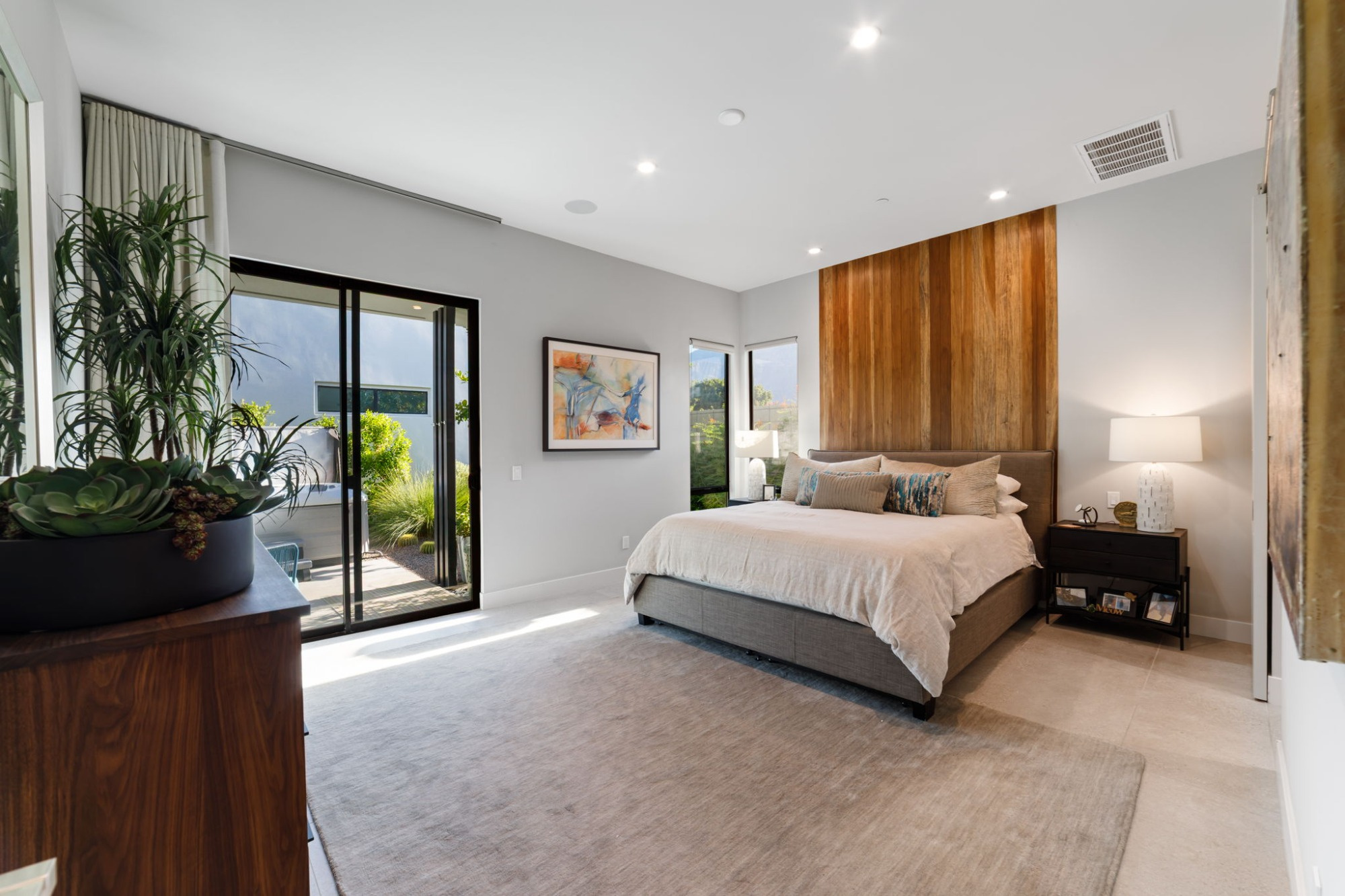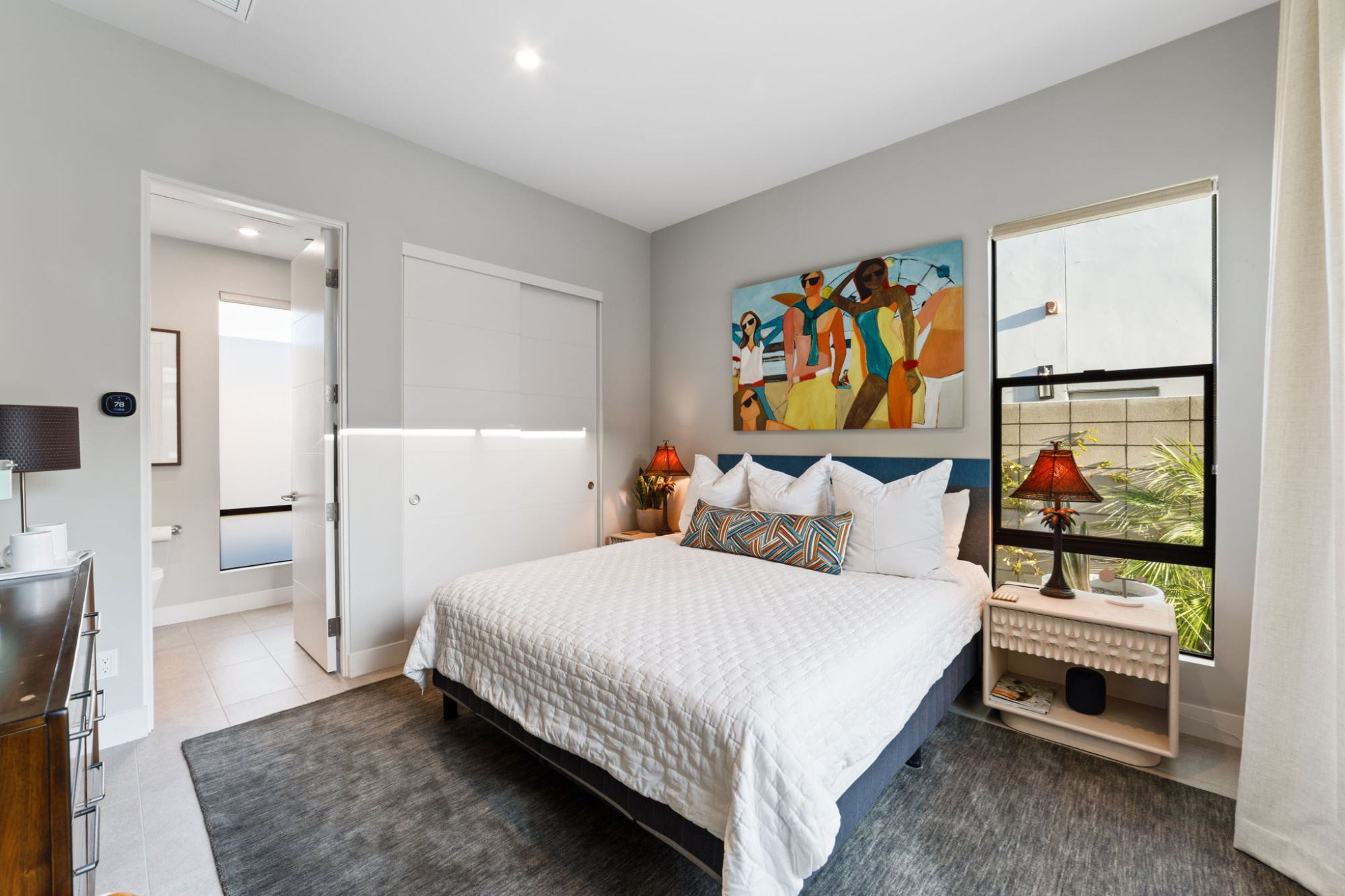 We are excited to introduce 111 Holliday Way, a stunning home in the recently completed Vue development in central Palm Springs. This former model home and end unit boasts one of the largest lot in the development and is ideally located within a pedestrian-friendly distance of downtown Palm Springs. This unique residence features three bedrooms, three and a half bathrooms, and a detached casita, perfect for guest privacy. It comes equipped with owned solar, a pool and spa, a built-in outdoor cooking area, and a two-car attached garage. Inside, you'll find numerous upgrades and thoughtful design elements. The dining area is highlighted by a modern chandelier and impressive 20-foot ceilings. The open-concept kitchen serves as a central gathering space, seamlessly connecting to the living area with a fireplace on one side and the dining area, which leads to an upstairs Library Loft, Private Bedroom and expansive Deck. All bedrooms are en-suite, providing comfort and convenience. The home includes multiple outdoor seating areas offering views both east and west from multiple levels and truly special views of Mt. San Jacinto. The home is located within a gated community and offers the new owner an abundance of privacy. Some furnishings are available outside of escrow, and a detailed list of upgrades is attached to the listing.